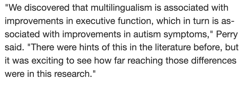 Recently, at the University of Miami researchers concluded some important and necessary points: Multilingualism is associated with cognitive improvements and it's also associated with improvements in autism symptoms. Why does this matter? Because as this administration seeks to vilify and nullify bilingualism and autism, education shines a light on the possibilities. Supporting multilingual speakers is an investment in our society. Funding the education and services of multilingual speakers is smart. See this point from the summary for yourself: